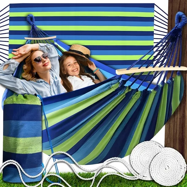 Ten dwuosobowy hamak ogrodowy wykonany jest z wysokogatunkowych materiałów, gwarantujących niezawodność, trwałość i bezpieczeństwo nawet podczas intensywnego użytkowania. Dzięki temu możesz mieć pewność, że będzie Ci służył przez wiele lat.