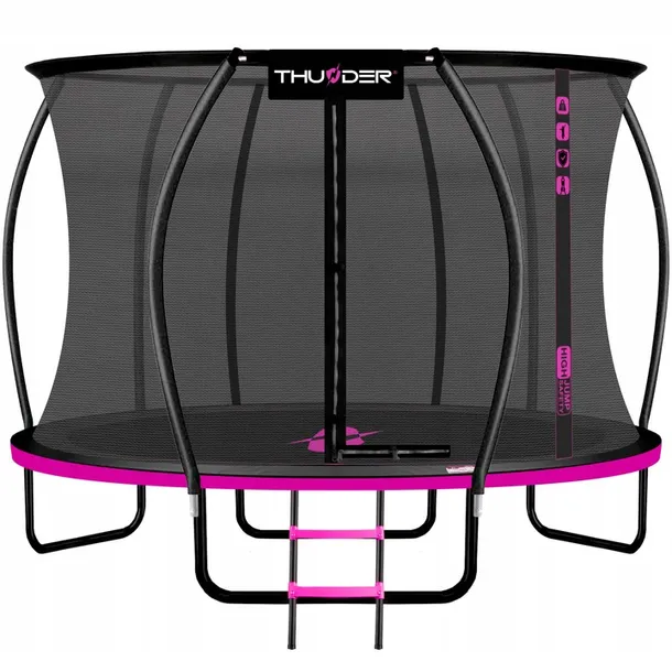 Ta trampolina przeznaczona do użytku ogrodowego, OGRODOWA 366cm 12FT dla dzieci z siatką wewnętrzną, opracowany przez THUNDER®️ULTRA 12FT PINK, zapewnia wysoką jakość skoków, dzięki świetnej elastyczności i wytrzymałości posiadanej przez nadmierną liczbę mocnych, hartowanych sprężyn. Projekt trampoliny jest skrupulatnie przezorny i odporny na zużycie.